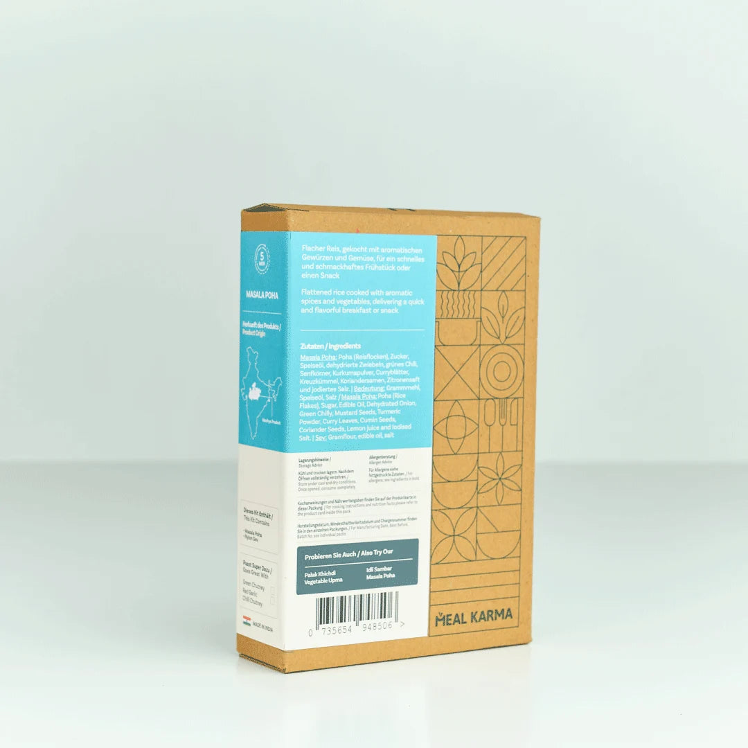 Poha (Rice Flakes), Sugar, Edible Oil, Dehydrated Onion, Green Chilly ,Mustard Seeds,Turmeric Powder,Curry Leaves, Cumin Seeds, Coriander Seeds, Lemon juice and Iodised Salt.