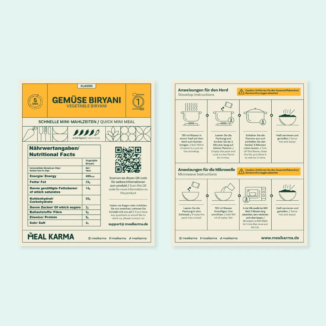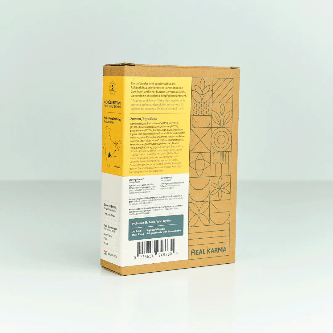 Basmati Rice (34,14%), Potato (13,31%), Coconut oil (11,28%), Carrot (11,27%), French beans (11,27%), Garlic (4,4%), Mint leaves, Ginger, Salt, Coriander powder, Greenchilli, Coriander leaves, Turmeric, Jeera powder, Cumin, Cardemom powder, Kashmiri chilli powder, Red chilli powder, Garam masala, Kewra water, Rose water, Bay leaf, Biryani masala, Mace powder
